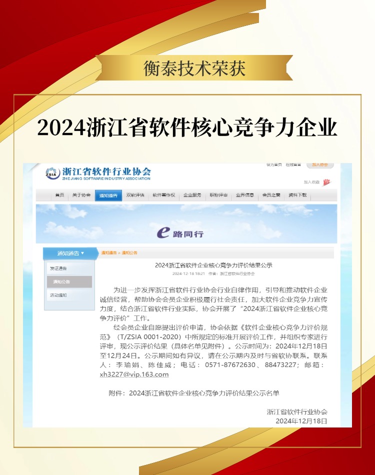 最新出爐的”2024浙江省軟件企業核心競爭力評價“,衡泰技術憑借卓越的綜合實力與持續穩健發展,連續第四年上榜。
